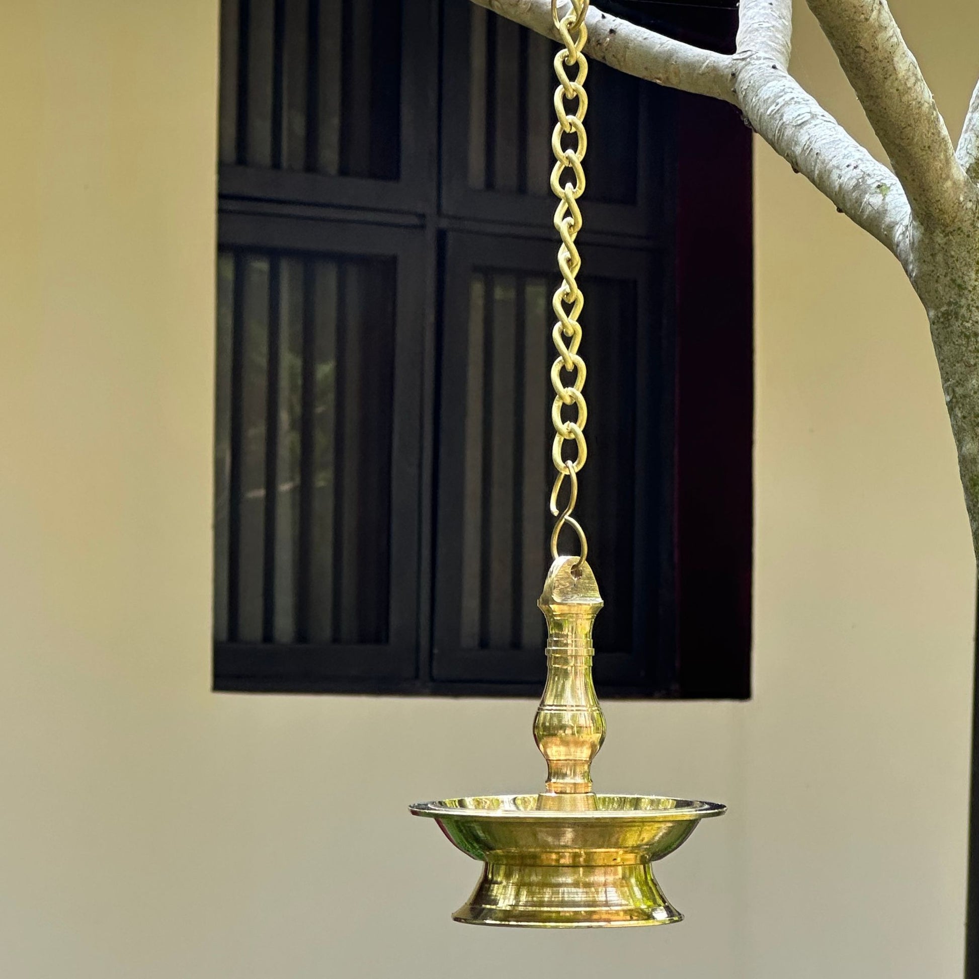 Suspended from a polished brass chain, it embodies simplicity and sanctity. When lit with sesame oil or ghee, it catches the warm gold of the flame, making it ideal for verandahs, altars, and quiet spaces of meditation.